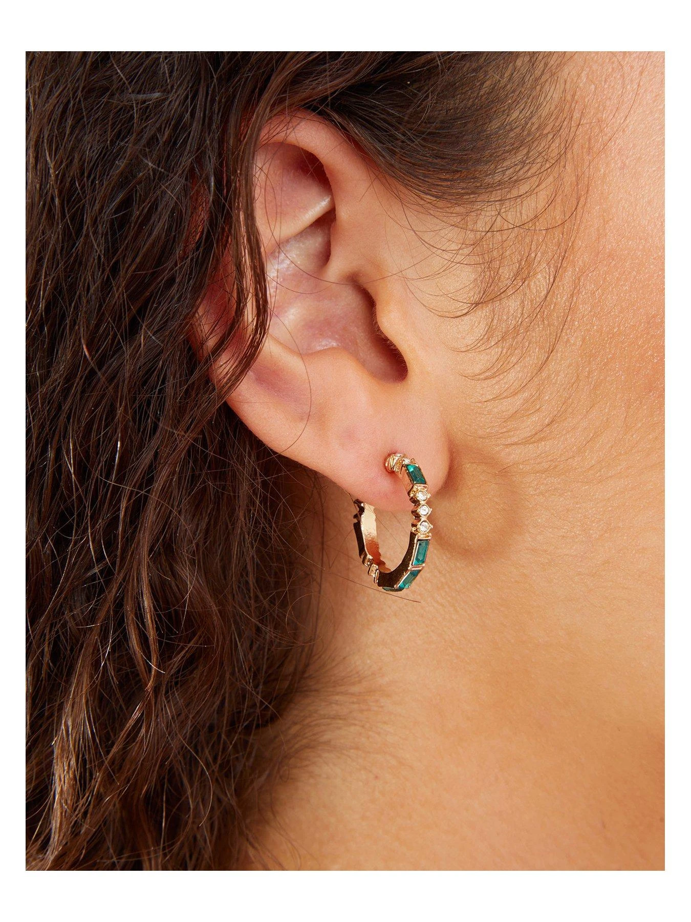 Filled with shiny green tones, these earrings are designed with a collection of gems in a hoop profile. The elegant gold and green combination makes them the perfect pair for partying. Non-refundable.