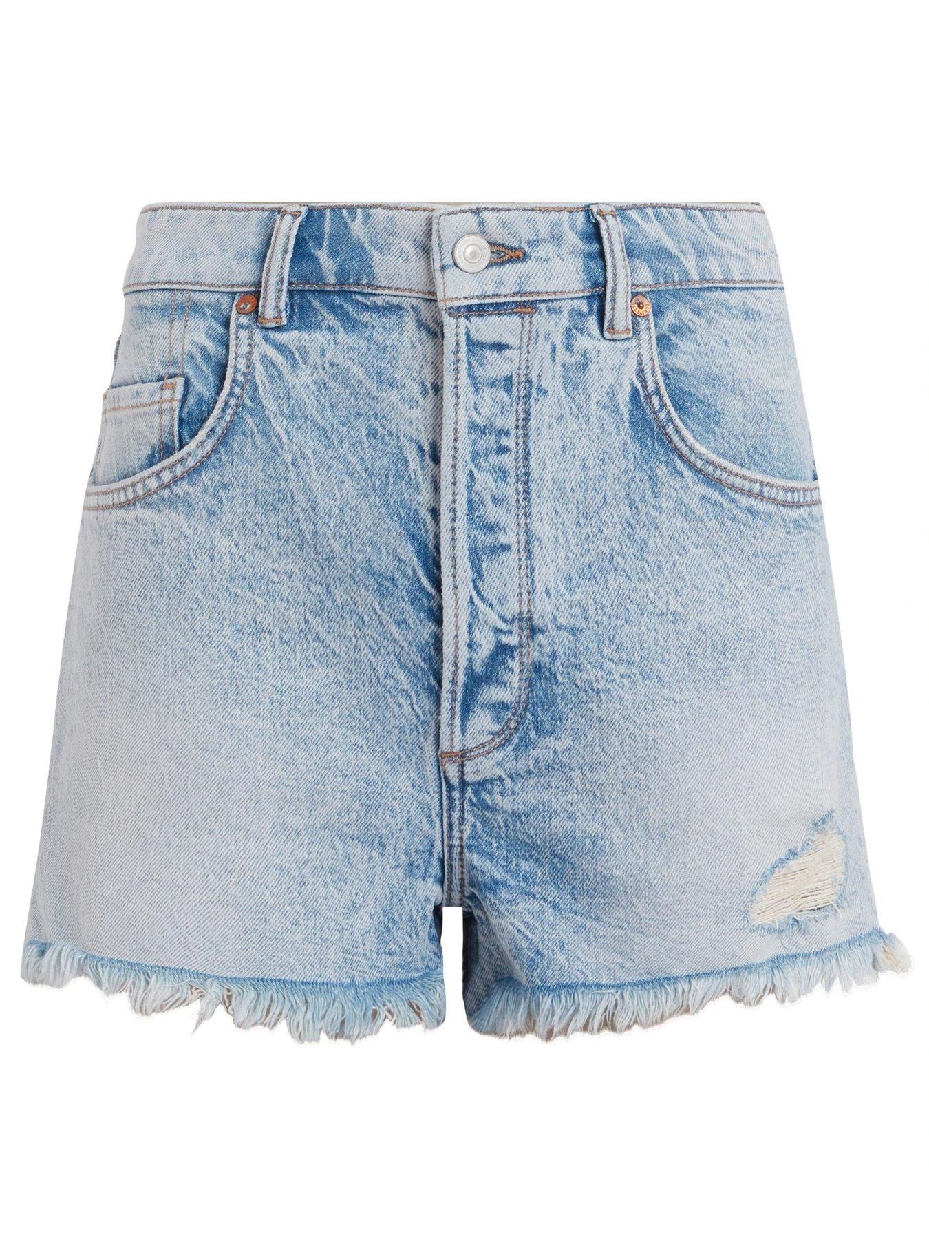 - A warm-weather essential, these denim shorts sit high on the waist and feature distressed detailing for a worn look