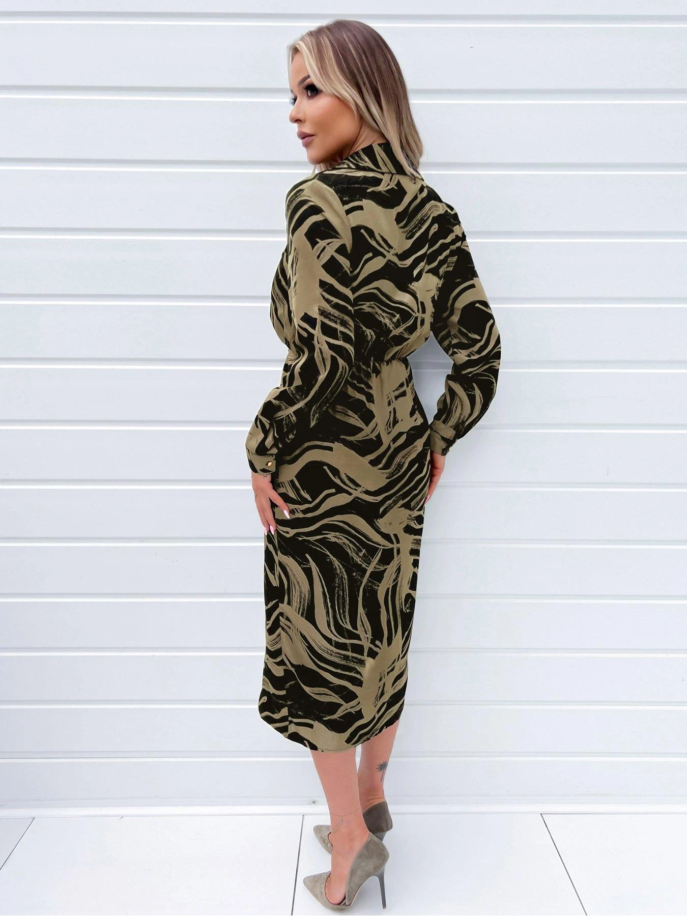 AX Paris Black And Khaki Print Wrap Collared Midi Dress