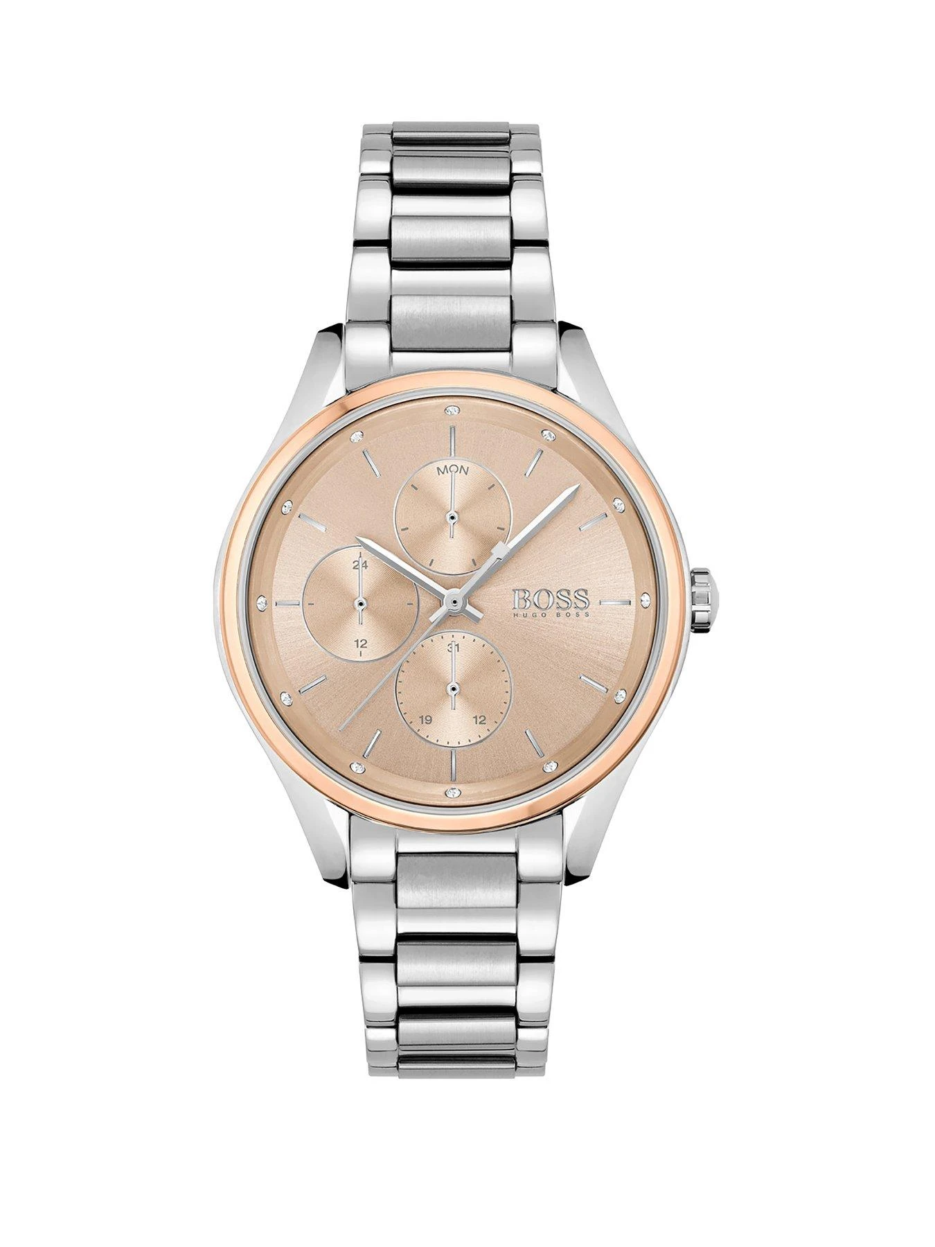 BOSS ladies watch from the Grand Course family. Featuring a 36mm stainless steel case, carnation gold sunray dial with crystal detail, stainless steel bracelet and push button deployment. Water resistant to 3ATM