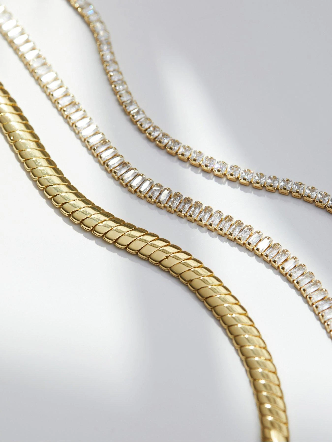Made from Recycled Brass and plated in 14k Gold, the Inicio cubic zirconia tennis bracelet has been curated to wear solo or stacked with other bracelets. Inicio jewellery will arrive to you in a reusable velvet pouch.