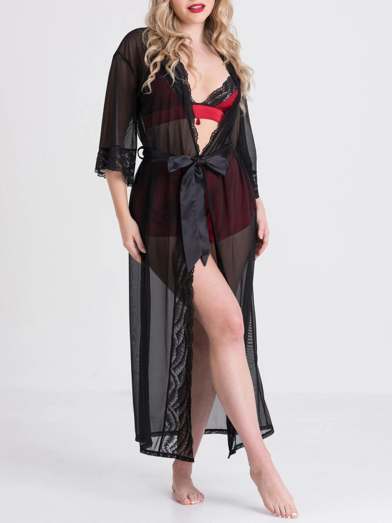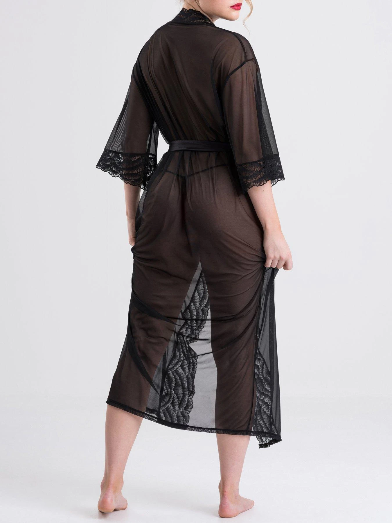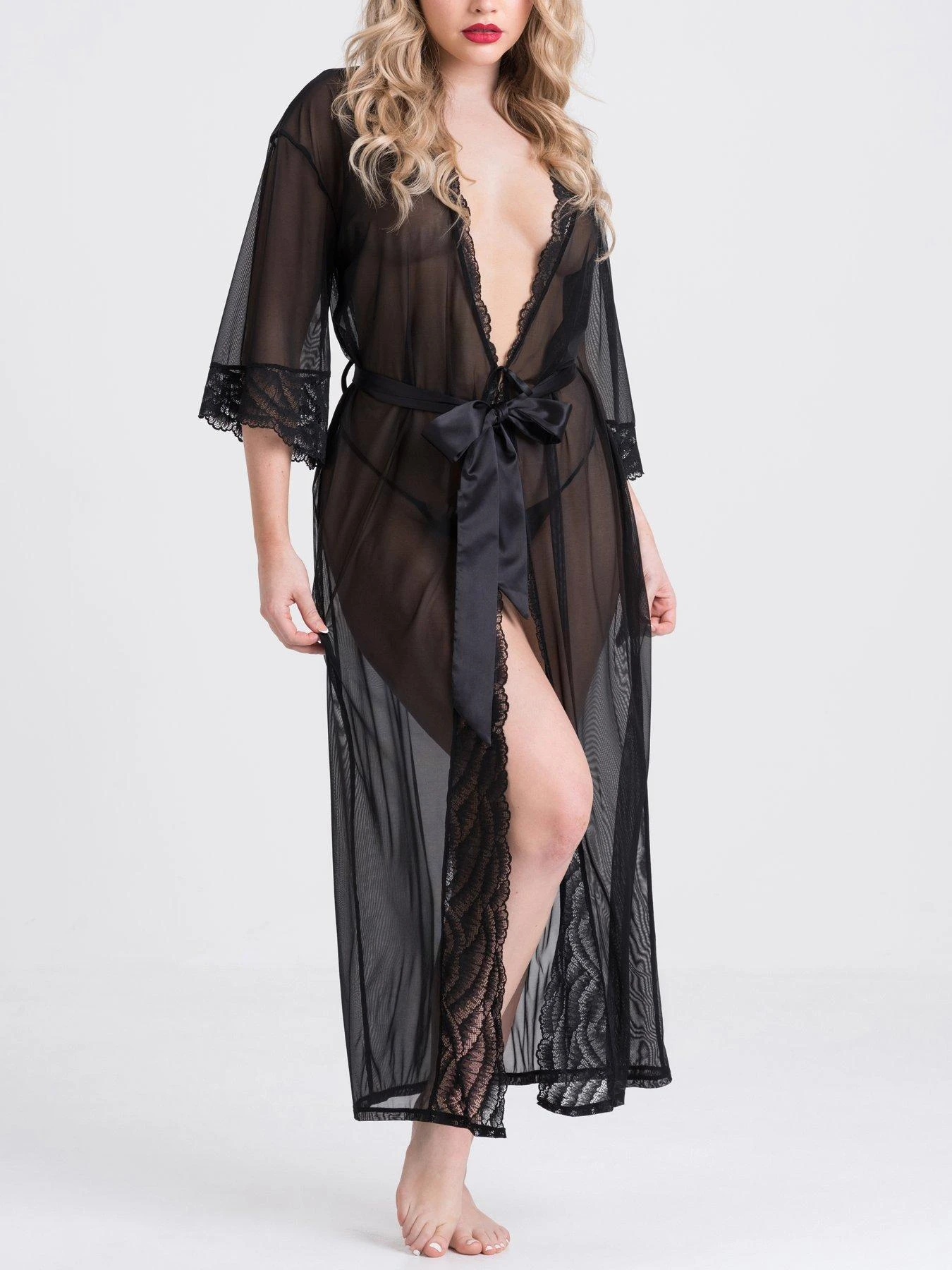 Create a sultry temptress look with this gorgeous Lovehoney Empress robe. Coloured in a shade of rich caviar black, the soft, sheer mesh hangs loosely off your curves, revealing a hint of the lingerie or skin beneath – perfect for plans of seduction, or for simply lounging luxuriously around the house. Featuring delicate lace trims along the sleeves and neckline with a sumptuous satin tie for cinching in your waist – and slowly undoing when the time is right – this long robe is an elegant addition to any wardrobe. Long black robe with lace trim details for opulent lounging or slow seduction. Stretch mesh and a satin tie sits gently on your figure for a flattering silhouette. Lace trimming highlights the flowing sleeves and neckline for a chic yet relaxed look. Sheer design allows you to cover up while keeping it sexy. Flexible sizing makes it an excellent gift for a lover, friend or yourself.
