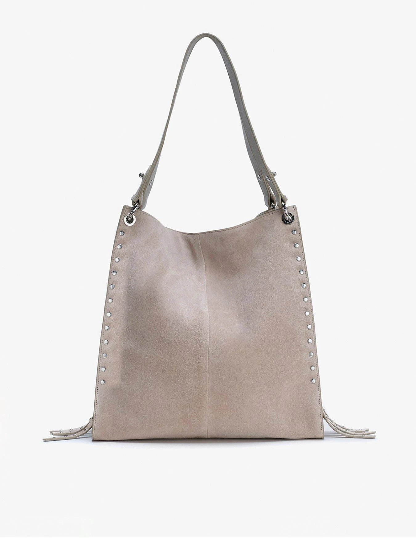 Artfully crafted from butter-soft neutral suede, this bag features silver-tone hardware and tasseled detailing for an elevated take on the boho trend we love right now.