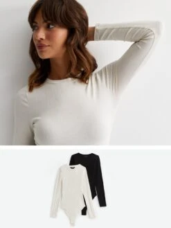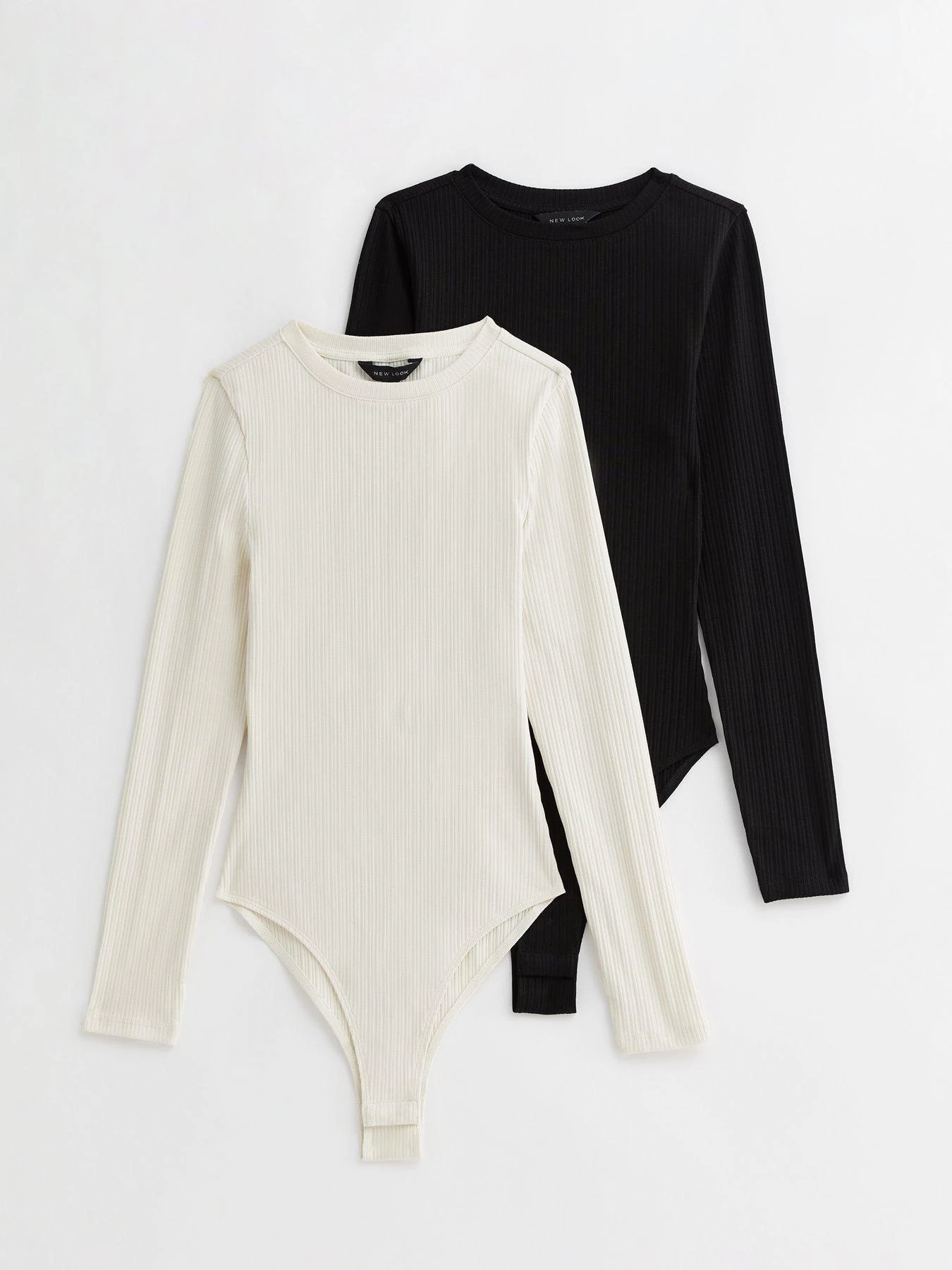 New Look 2 Pack Black and Cream Ribbed Long Sleeve Bodysuits