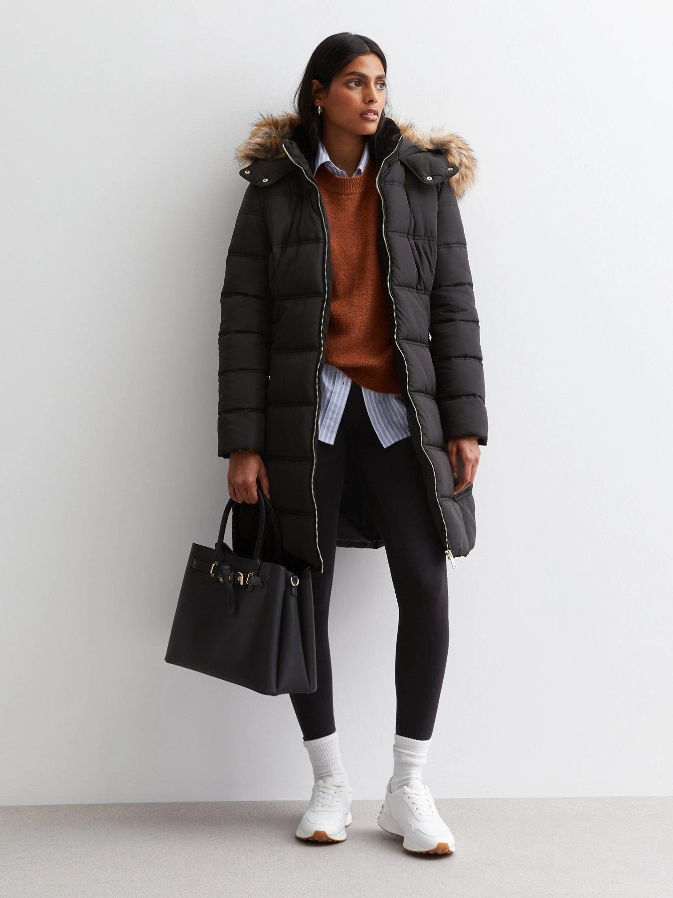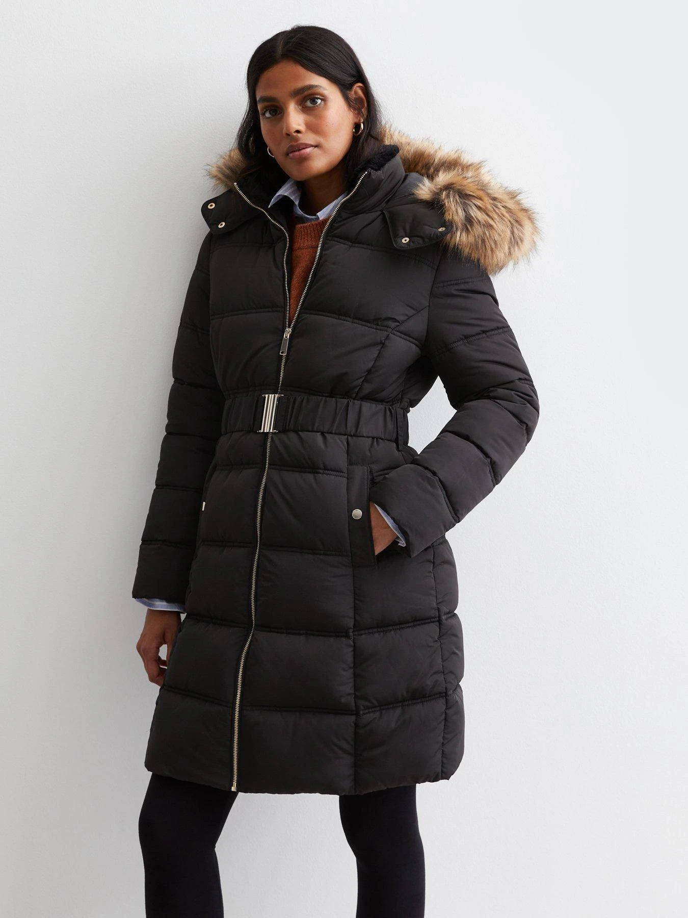 New Look Black Faux Fur Hood Belted Puffer Coat