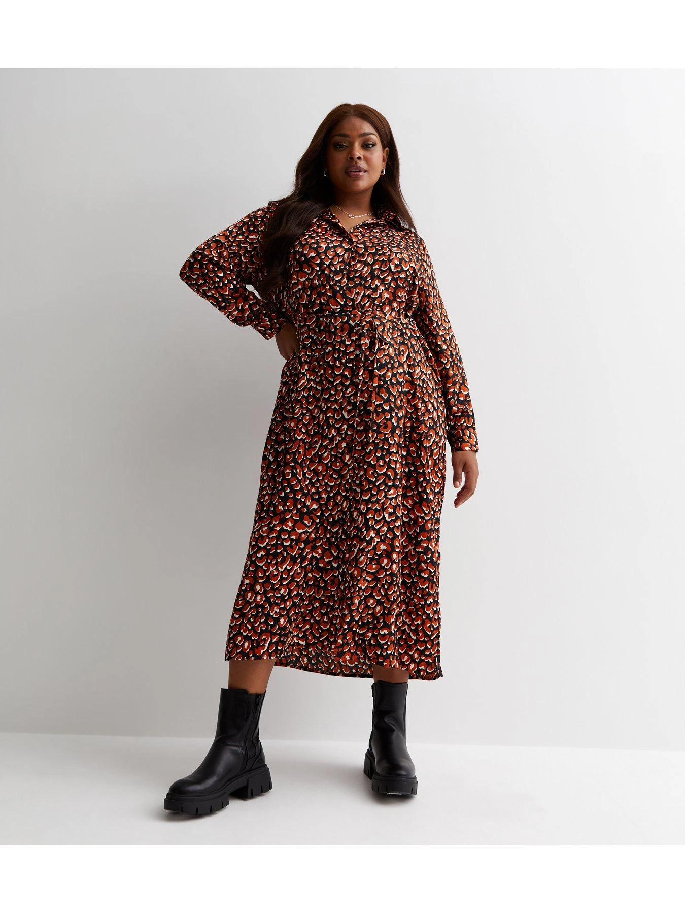 New Look Curves Red Leopard Print Satin Tie Waist Midaxi Shirt Dress