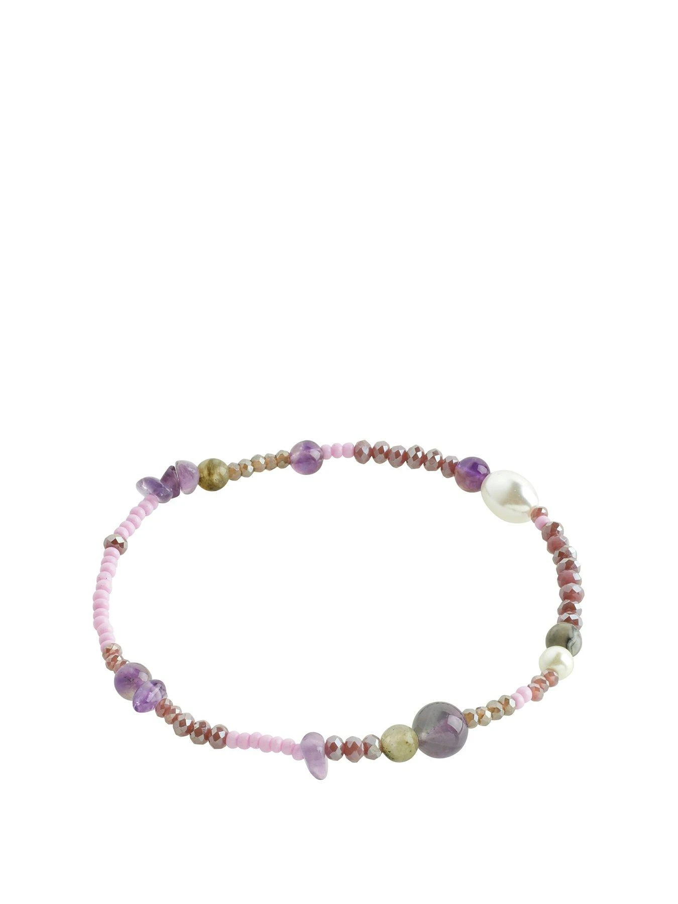 Beautiful pearl bracelet with genuine freshwater pearls and the semi-precious stone amethyst. Small, faceted glass beads in shades of purple combined with the different sizes and shapes of the stones give the bracelet an effortless and organic look. The perfect item to combine with other bracelets in a trendy, stacked look for a unique and personal style. The bracelet is assembled with a durable Lycra elastic and fits most wrists. It measures 16.5 cm.