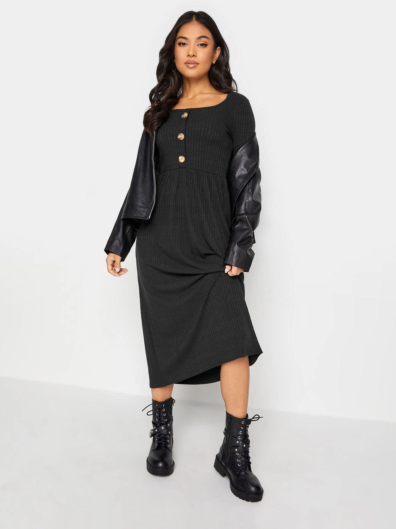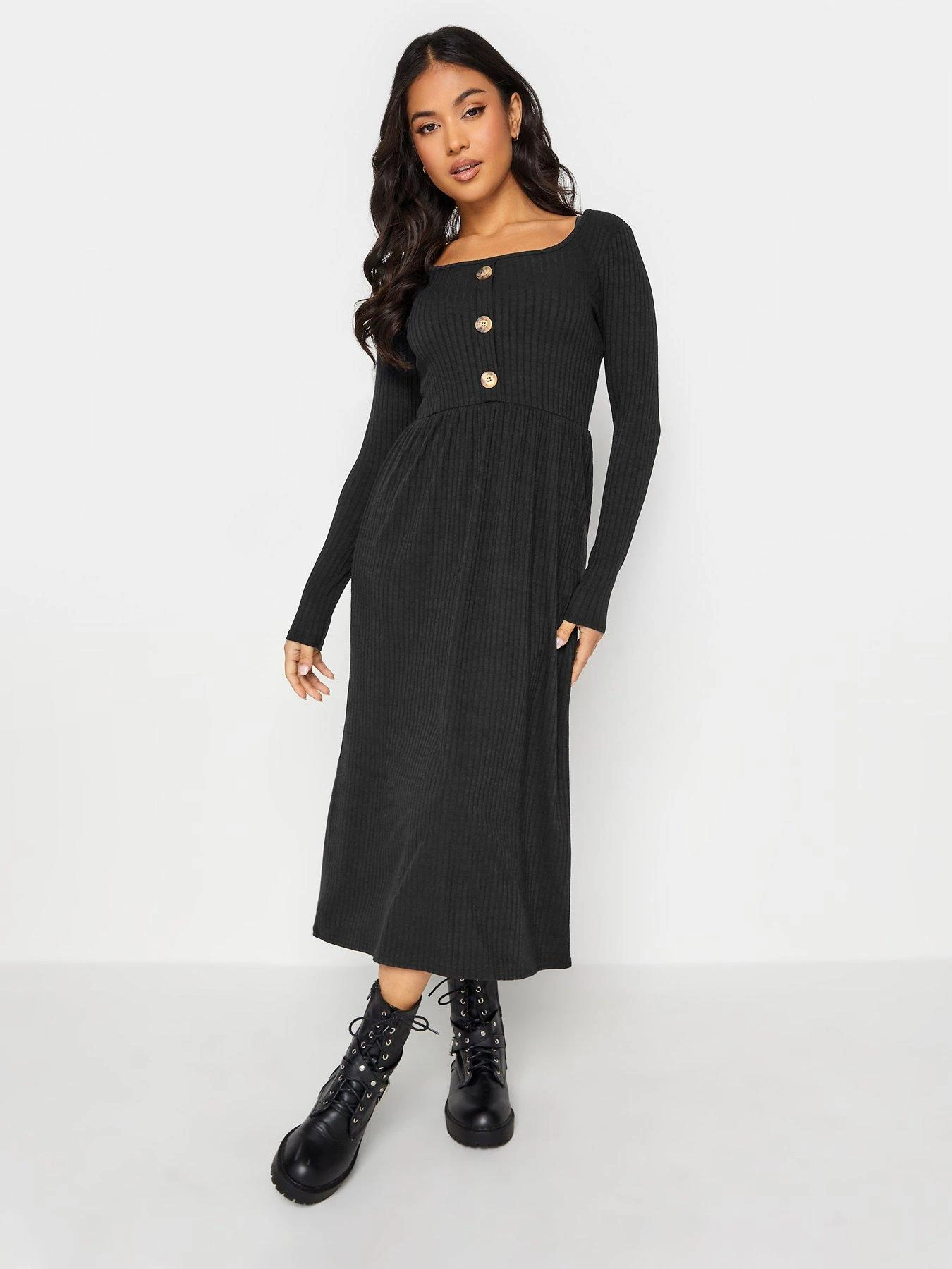 PixieGirl Petite Black Long Sleeve Rib Button Midaxi Dress