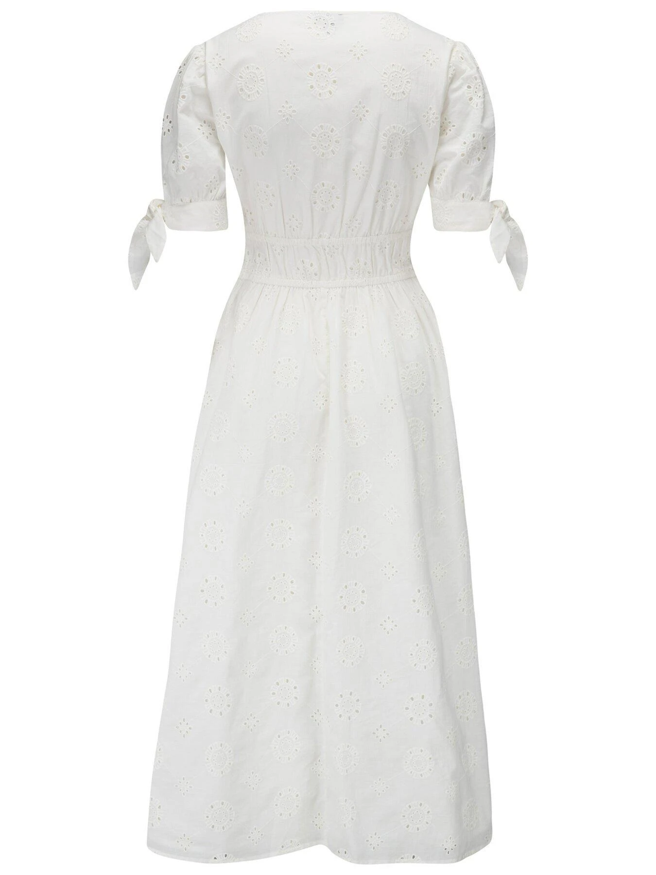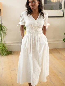 Crafted from soft cotton and decorated with delicate schiffli embroidery, the Amanda Midaxi Dress is perfect for those warmer months. Made from breathable cotton, this midaxi length dress with a beautiful V-neckline is ideal for summer days when you have plans. Simply slip on this comfortable dress with elastic waist channels and finished with functional bodice buttons and short sleeves with tie detailing and head to any summer soiree in comfort and style. Designed with D+ babes in mind so you can look fabulous and still feel comfortable and supported.