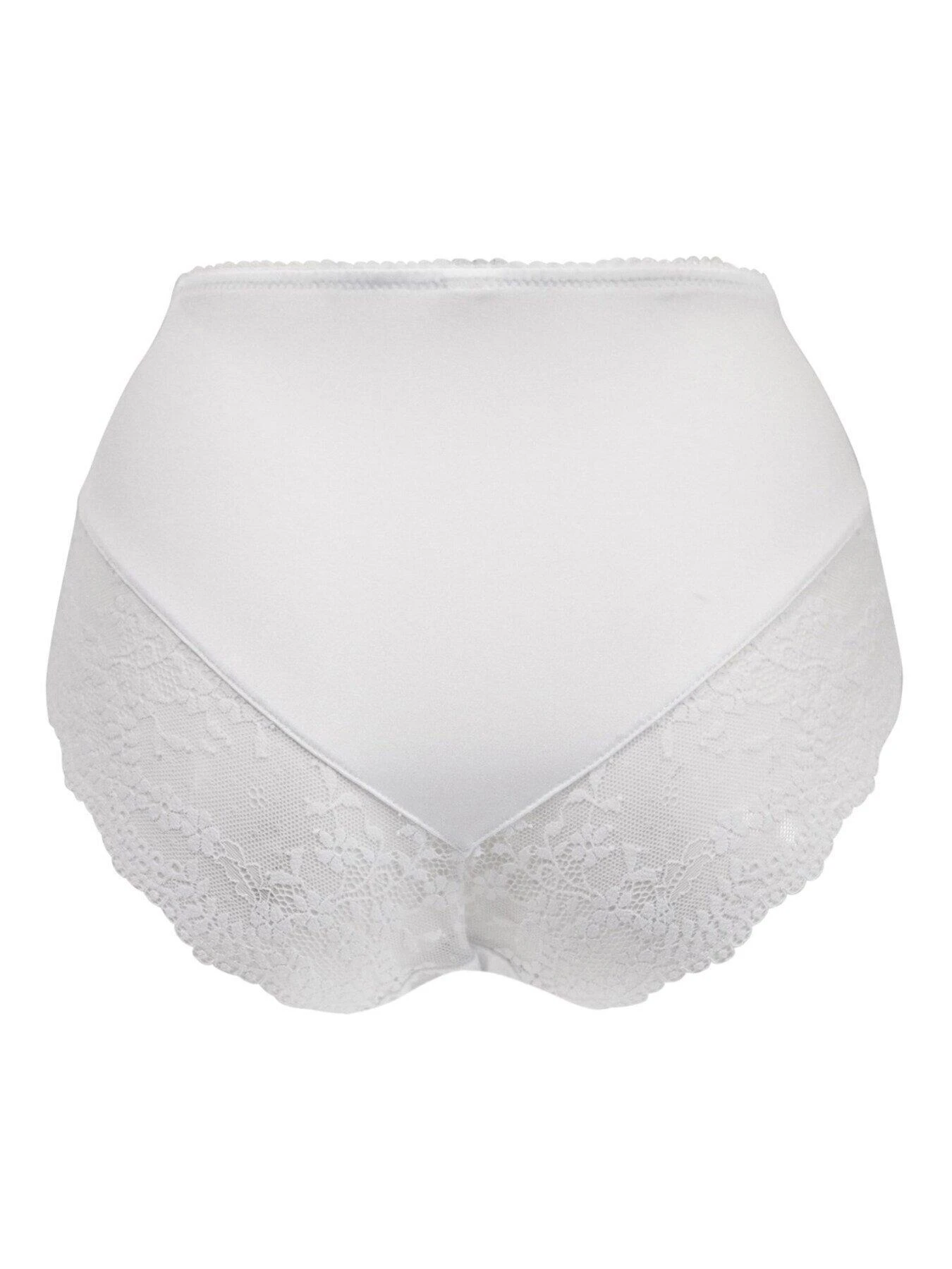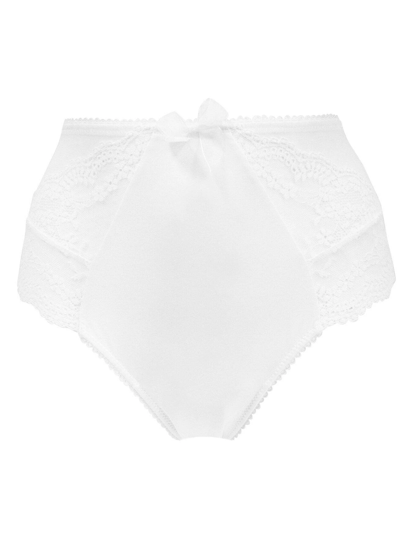 A deep style brief for full coverage High-waisted Side lace panelsScalloped edgingSoft elasticated waistbandPretty spoot mesh detail on sidesDelicate Flora bow on front’ These beautiful high-waisted full briefs are designed with pretty side lace panels to feel your fabulous self. This classic shape is completed with soft elasticated waistband and scalloped edging for a feminine finish. Match with one of our beautiful Flora bras for the perfect pairing.