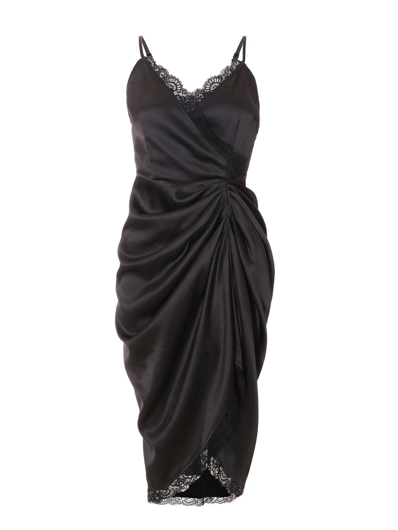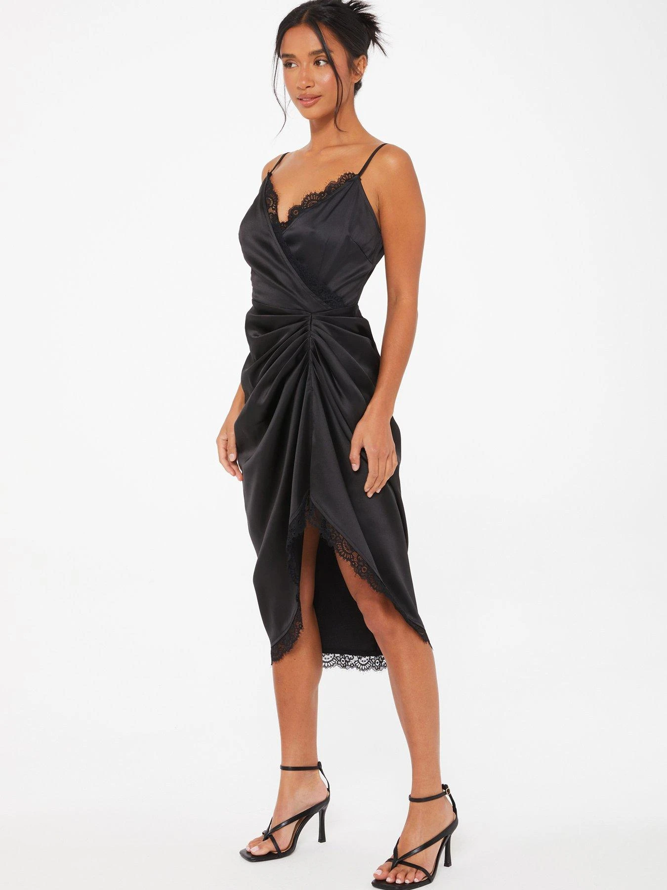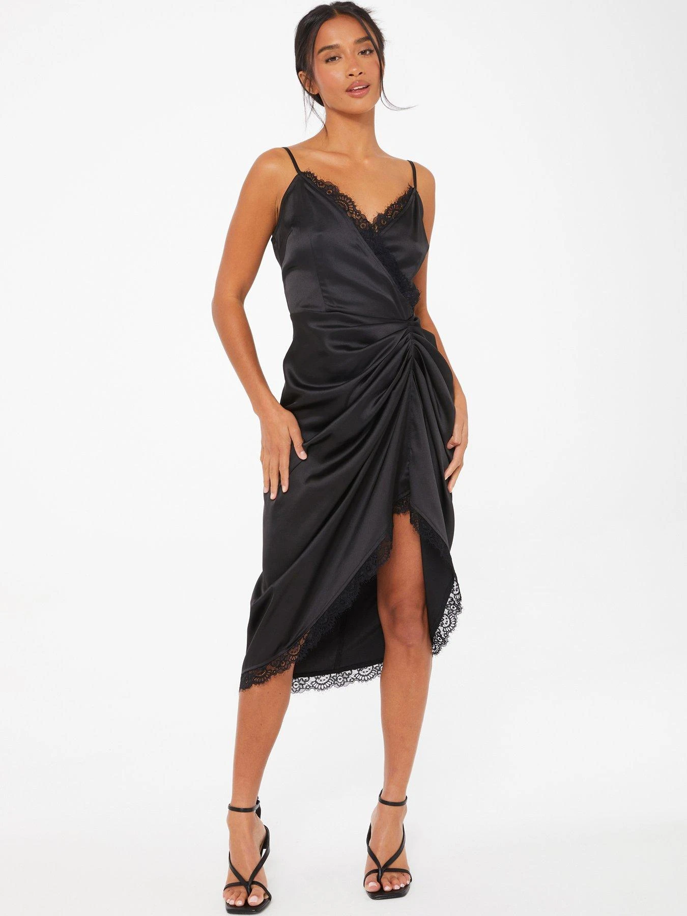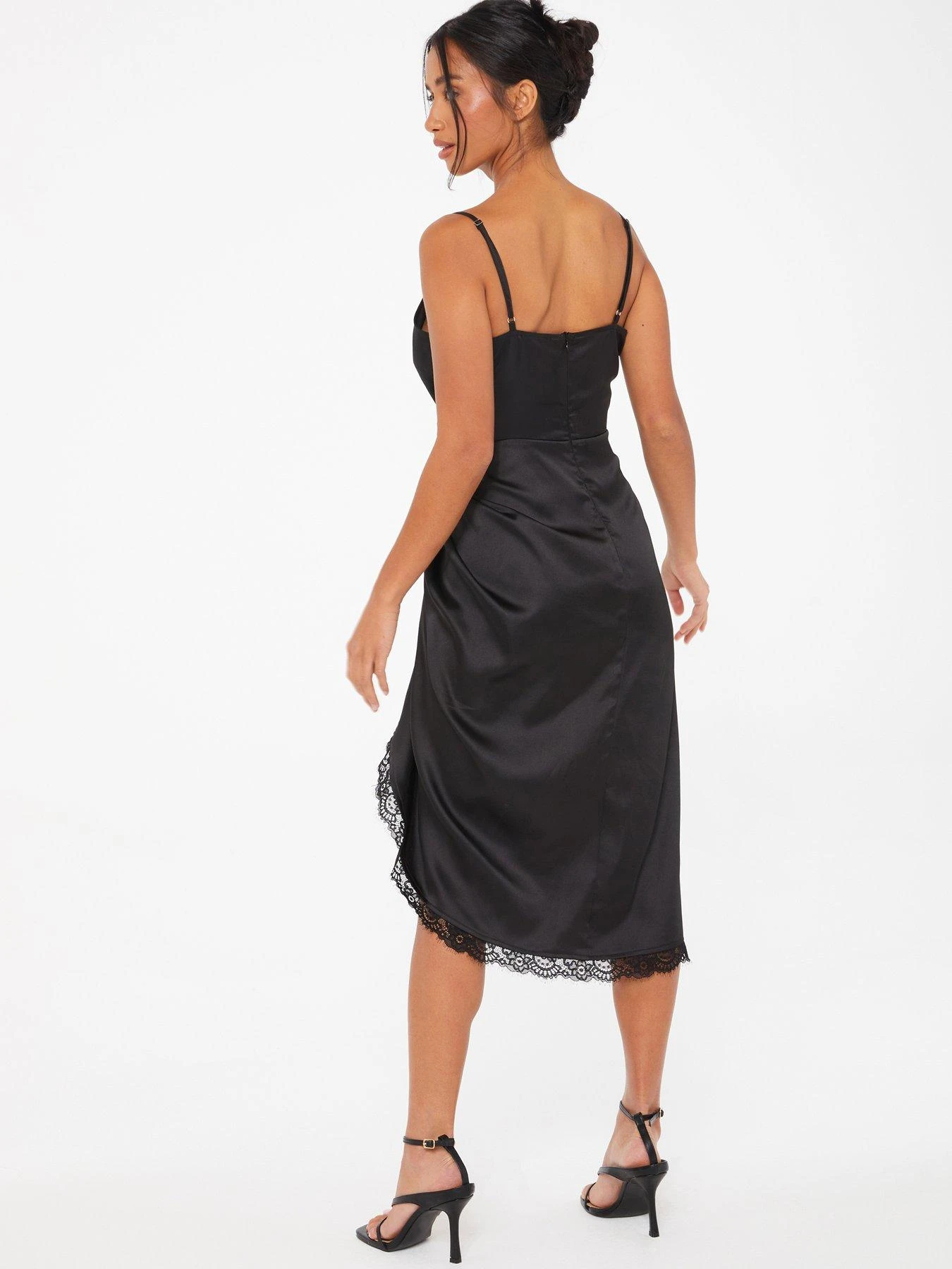 Quiz Petite Black Satin Lace Trim Midi Dress