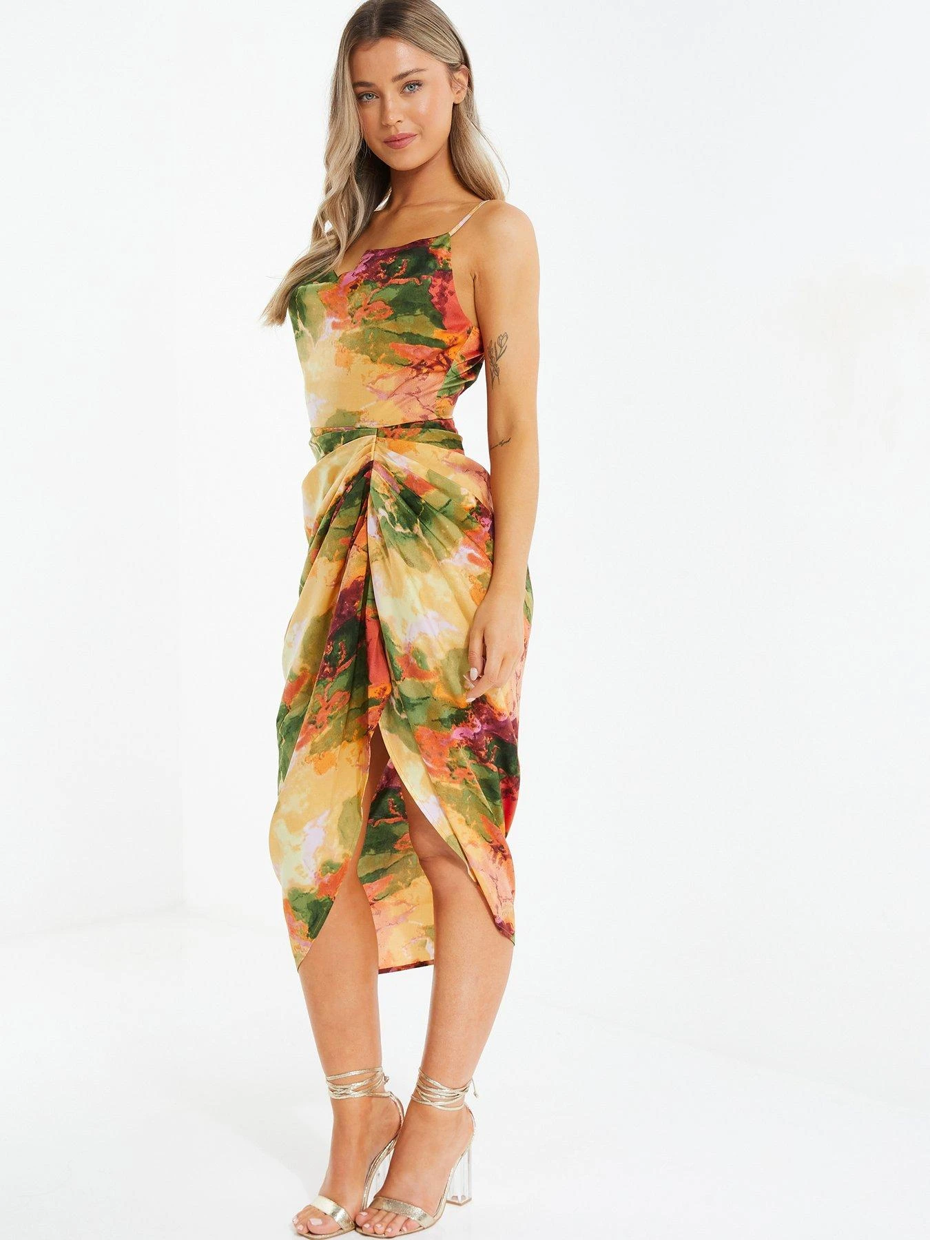 Quiz Petite Multicolored Satin Marble Print Ruched Midi Dress