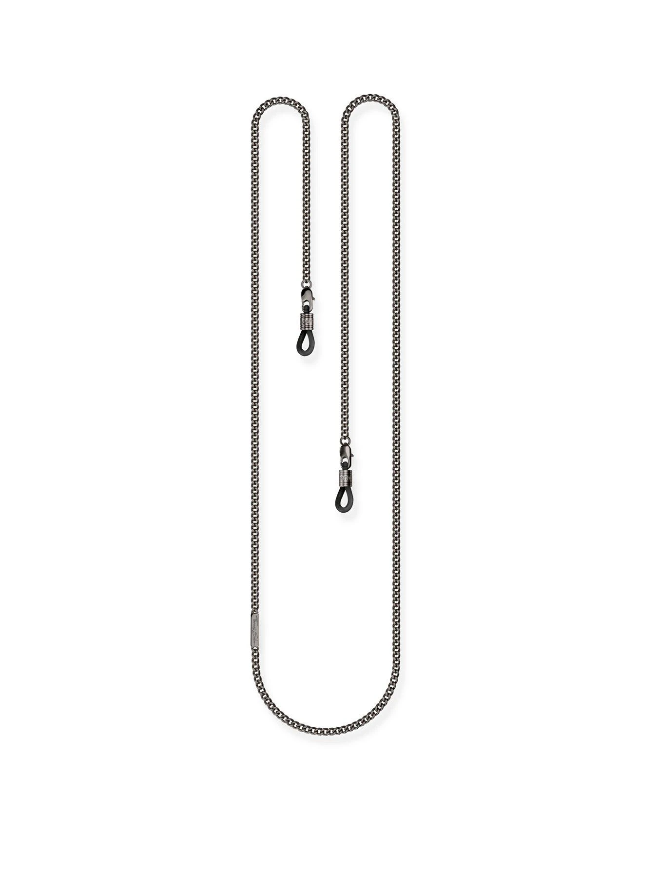 Metal eyewear chain with silicone loops at the ends to attach to the temples. The small metal elements of the silicone loops with THOMAS SABO logo can be moved so that the loop can be fixed easily and securely to any temple.