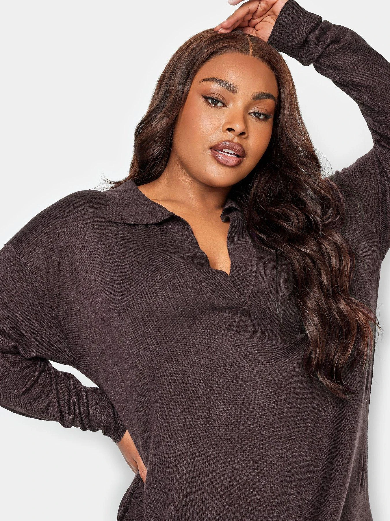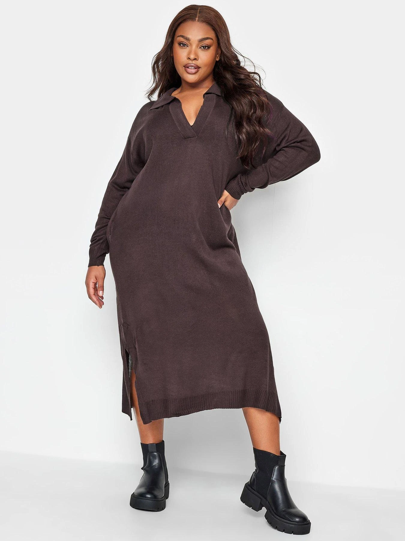 This fine knit plus size jumper dress is set to be your new favourite this season. Made from a soft knitted fabric, it features long sleeves with an open collar and finishes at a midi length. Style with tights and boots for the perfect weekend look!