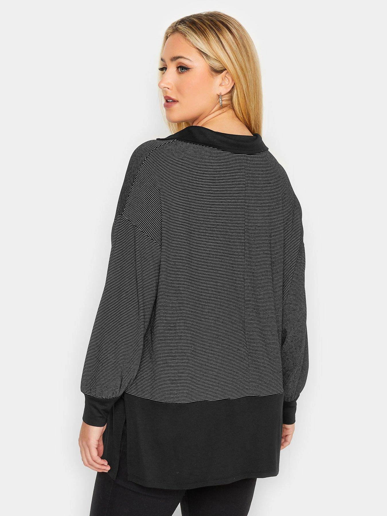 No wardrobe is complete without this staple black top. Made from a comfortable jersey fabric, this polo collar features a frill hem complete with long sleeves. Pair this must-have with your favourite jeans and trainers for the perfect casual look.