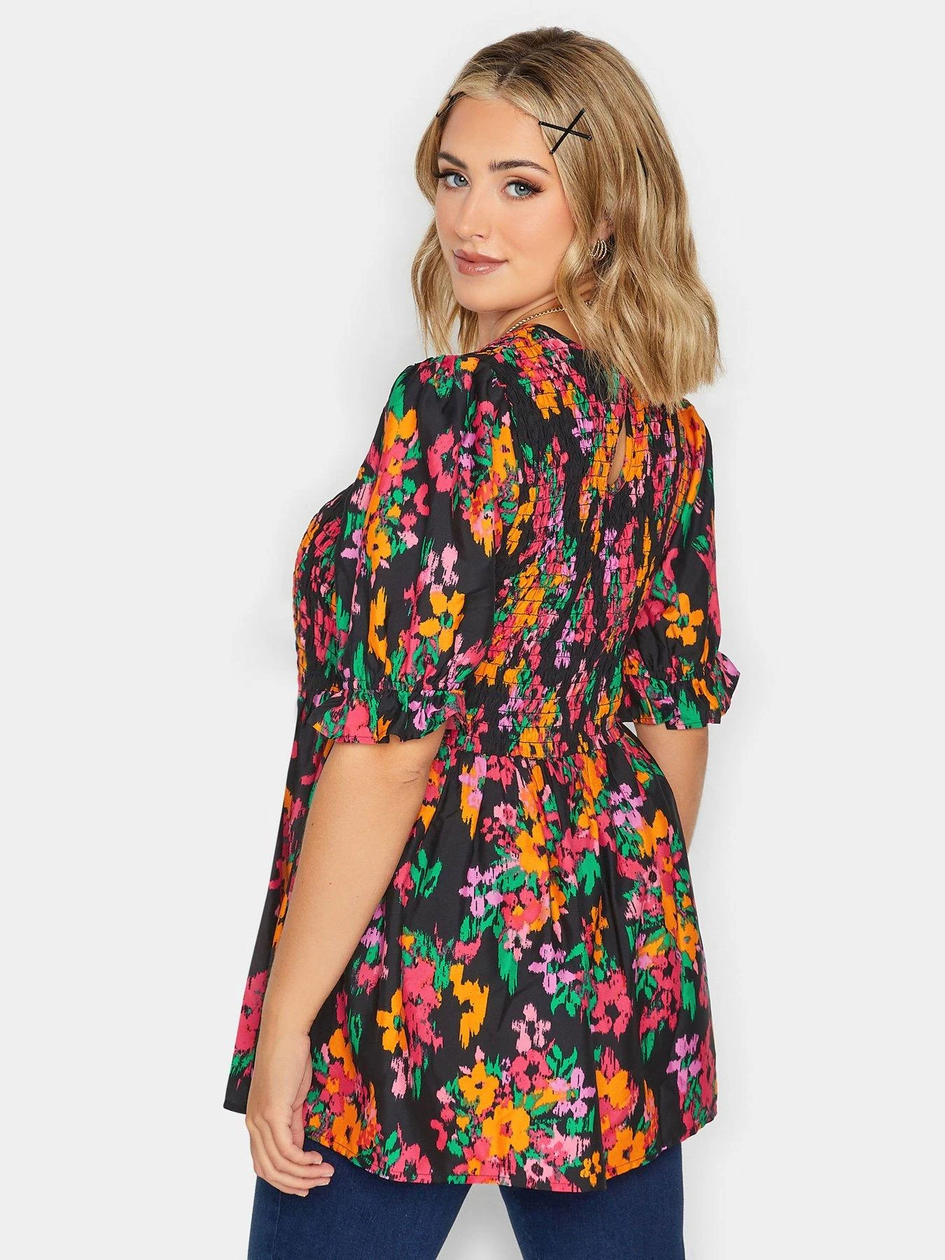 Yours Shirred Puff Sleeve Top Bright Smudge Floral