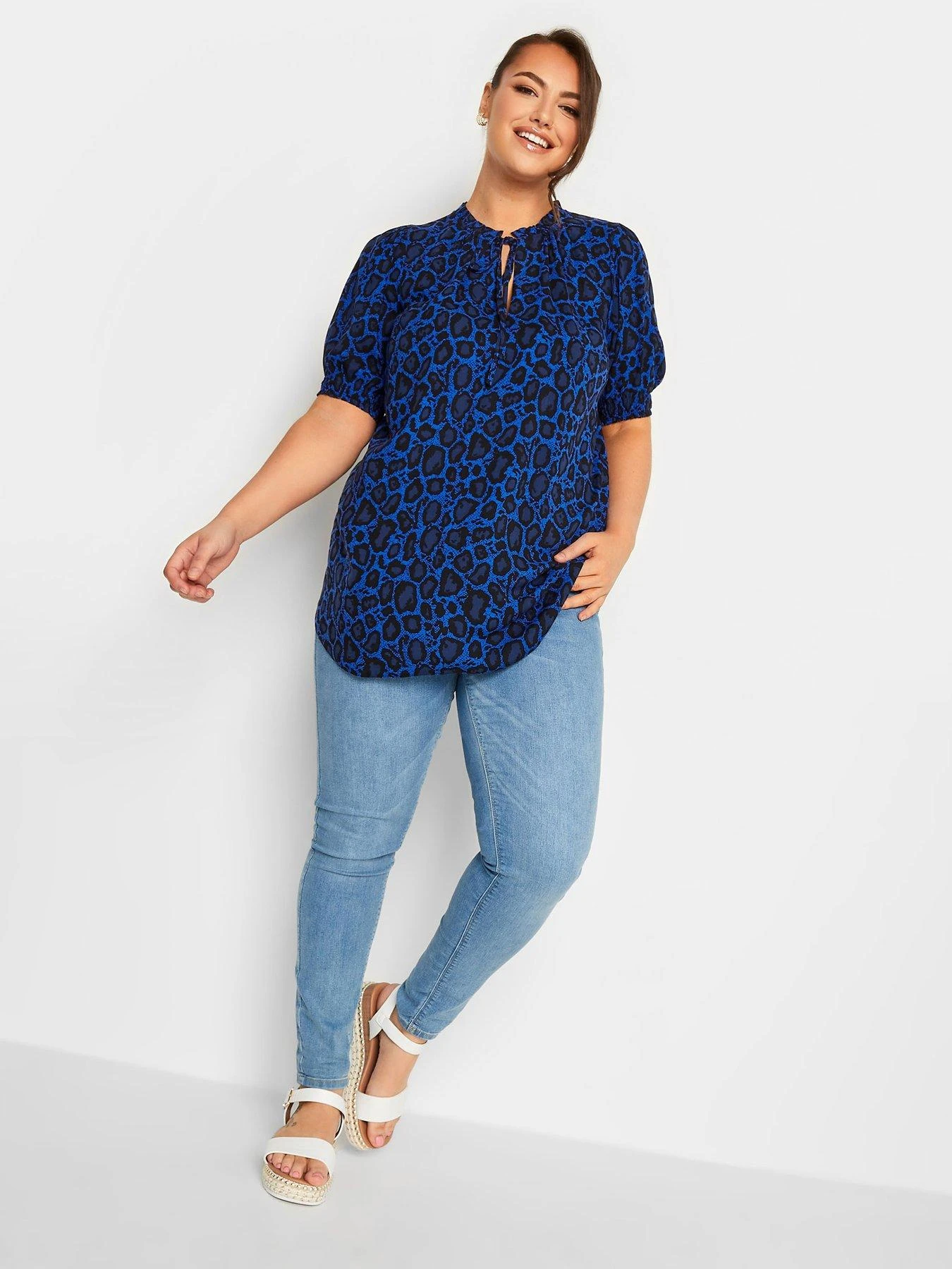 Yours Tie Neck Short Sleeve Blouse Blue Wild Print